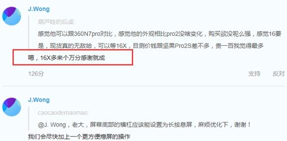 至于魅友关心的售价,有魅友在社区猜测:“魅族16x目测价钱跟坚果Pro 2S差不多,贵一百我觉得最多”。对此黄章给出的回应是:“嗯,16x多来个万分感谢就成”。