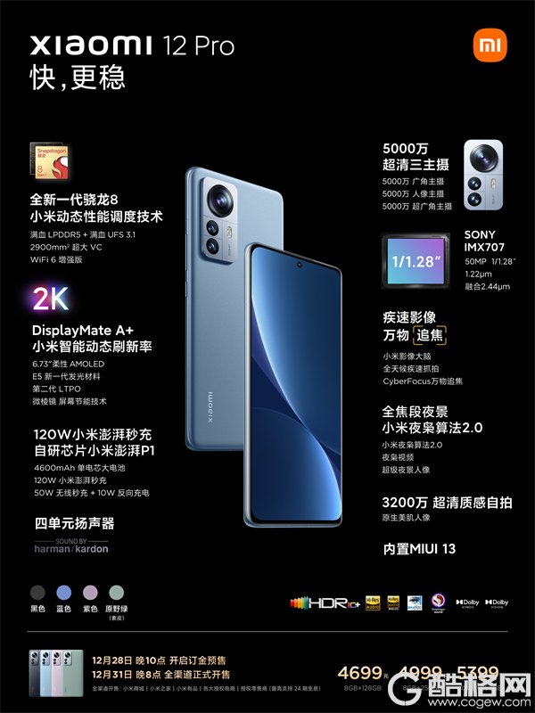 小米12 与小米12 Pro 均具备四种颜色,其中黑色、蓝色,紫色为玻璃材质,原野绿配色为素皮材质。小尺寸高端旗舰小米12 8GB+128GB版3699元,8GB+256GB版3999元,12GB+256GB版4399元;全能高端旗舰小米12 Pro 8GB+128GB版4699元,8GB+256GB版4999元,12GB+256GB版5399元;小米12X搭载骁龙870,8GB+128GB版3199元,8GB+256GB版3499元,12GB+256GB版3799元;以上产品12月28日 晚10点开启订金预售,12月31日晚8点全渠道正式首销。小米拍拍4K高清投屏器已开启线上预约,售价499元。小米Watch S1首销到手价1049元起,小米真无线降噪耳机3首销到手价449元,12月31日晚8点全渠道首卖。小米真无线降噪耳机3 Pro新年特别版12月28日-1月3日开启新年特惠首卖,仅售649元。