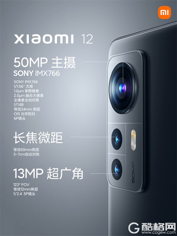 相机方面,配备在超大杯高端机中才会使用的索尼IMX766 5000万像素主摄,这款主摄也应用于华为P50 Pro、荣耀Magic3 Pro等机型,支持OIS四轴光学防抖;微距镜头支持长焦微距功能,等效50mm焦距,实现3-7cm自动对焦。小米12的相机速度启动提升21%,拍照提升53%、连拍提升209%,夜拍提升近40%,带来领先行业的全天候疾速影像拍摄体验。