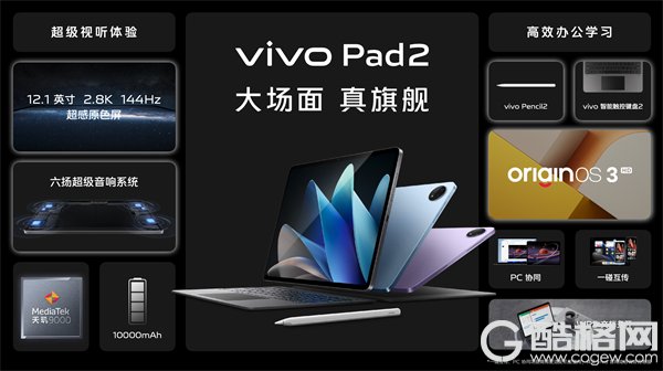 除此以外,vivo还发布了新一代的旗舰平板vivo Pad2,搭载定制的12.1英寸、2.8K、144Hz超感原色屏,天玑9000旗舰芯片,自研六扬超级音响系统,10000mAh超大电池,以及全新的vivo Pencil2和vivo智能触控键盘2等全线旗舰配置,全面释放出“大屏真旗舰”的产品性能。