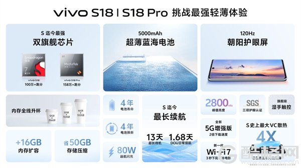 其它方面,vivo S18系列搭载120Hz朝阳护眼屏,2800nits峰值亮度媲美旗舰,强光下依然清晰;5000mAh超薄蓝海电池搭配80W闪充,轻薄手机也有超长续航,超长待机可达13天;S18 Pro同时支持5G载波聚合和全新WiFi 7 技术,从此告别信号焦虑。