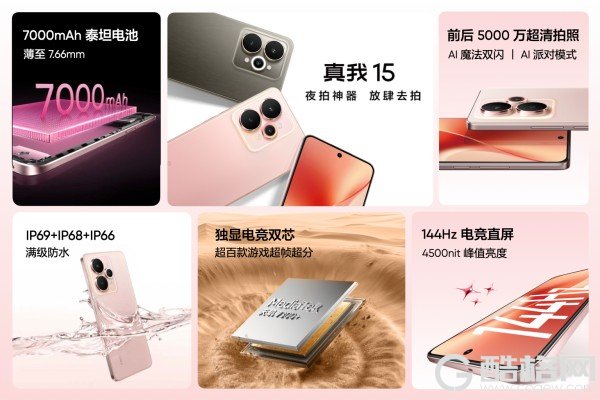 144Hz电竞直屏,与真我15 Pro形成“一直一曲”系列组合,拥有樱粉、钛灰两款配色;