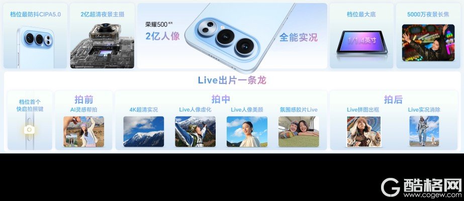 在影像体验层面,荣耀500系列带来档位超全实况体验,针对Live实况拍摄场景,行业首发前后置Live人像,让live帧帧有虚化,帧帧有美颜,帧帧有氛围。荣耀500系列还带来行业超全的氛围感胶片色彩,共有6种胶片Live任意挑选。同时,Live路人消除也让动态瞬间免受路人干扰,时刻主角。此外还支持4K转Live,轻松将4K视频转成4K Live分享朋友圈。
