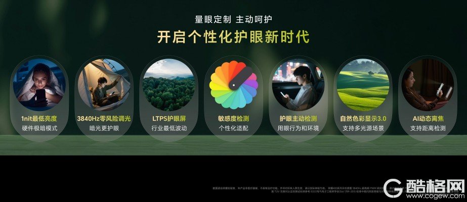 荣耀持续引领行业护眼赛道,荣耀500系列支持九大荣耀绿洲护眼特性,覆盖了自然光的波动、频闪、亮度、节律、光谱和色彩六大视觉维度,还提供了AI离焦护眼、AI干眼友好和晕动舒缓显示三大辅助护眼功能,不仅对于不良用眼行为进行主动提醒,还能智能检测不良环境光源,为用户构建对眼睛更加友好的居住和办公环境。