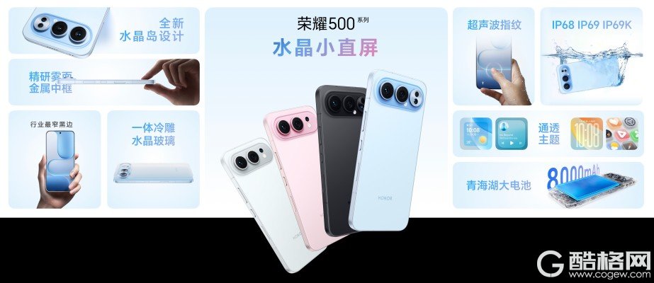 荣耀500系列还采用行业领先的一体冷雕工艺,历经40多道工序反复打磨,实现了镜头模组与背板玻璃的一体成型,质感浑然天成。得益于机身架构的重构,不仅实现7.75mm的轻薄机身和行业最窄1.05mm黑边,其独特的水晶岛镜头模组设计,也带来了更优的握持体验,无论是竖屏使用还是横屏游戏都舒适趁手,同时为超大电池预留出充足空间。