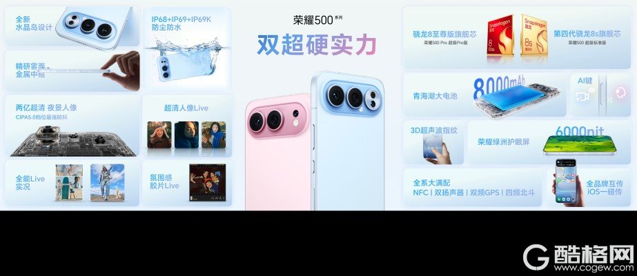 此外,新机支持IP68&IP69&IP69K行业至高防水等级,可靠性全面进阶。荣耀500 Pro还配备旗舰同款超声波指纹,湿手秒解,响应迅速,在细节处彰显旗舰级品质。