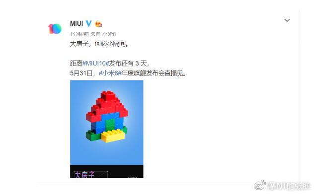 今天上午,MIUI官方微博发布倒计时3天的预热海报,主视觉是一个用乐高拼成的房子,在配图的下方并配有“大房子,何必小隔间”的两行文字。不禁让人联想到抛开以往的设计风格,MIUI10会在系统设计方面继续卡片化的深入探索。或许此次到来的MIUI10系统会在设计方面给大家带来更多的突破和惊喜。