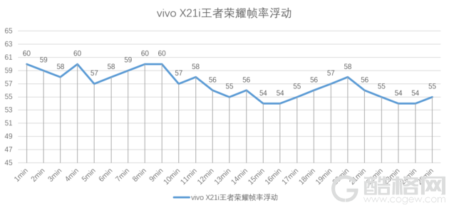 这局游戏一共费时25分钟,以一分钟为节点,分别记录下了帧率,绘制了直观的折线图,平均帧率为:56.84帧,完全能保持整局的流畅。并且发热也控制的相当到位,即使是长时间打游戏都能保证手感的舒适性。
