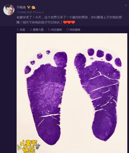 随后于晓光在微博晒孩子的脚印并发文:老婆辛苦了!今天,这个世界又多了一个爱你的男孩,你们都是上天对我的恩赐!祝天下所有的孩子节日快乐!