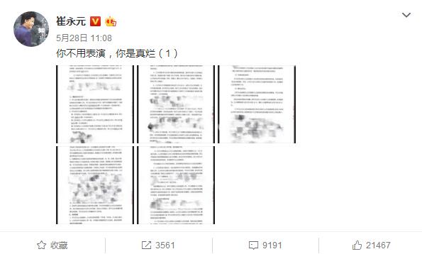 首先就是现在还在热搜榜一位的范冰冰 崔永元,这两人之间其实没啥实质性的内容。不过是崔大哥发布了几张合同的照片,虽然照片中的合同抹去了一部分文字,但是能看到应该是设计演艺相关工作的合约。在酬金及支付方式这一章节的具体款项中,可以看到“按照本合同规定安排范冰冰于规定聘期内参与本片演出工作”的内容,并且最终支付酬金为一千万元。疑似是在针对范冰冰。