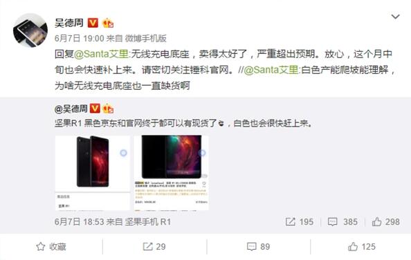 6月7日,锤子科技产品线&硬件研发副总裁吴德周通过微博表示,坚果R1碳黑色在京东和官网现货发售,纯白色版也很快会赶上来。
