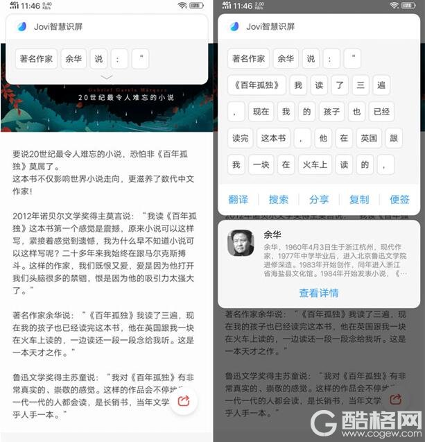 智慧识屏功能可以智能提取屏幕上的文字,实现快速查阅信息、预定酒店等。例如你平时在阅读时,对一段文字中的字、词不是很了解,在阅读界面中长按文本,智慧识屏功能就可以将那段被按住的文字按照语义拆分成易于选取的字或词。你可根据个人选择,将字或词翻译、搜索、复制、分享等,易用便捷。