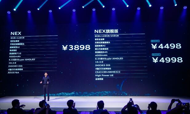 发布会现场,vivo公布了NEX的官方定价。其中,vivo NEX市场售价人民币3898元,NEX旗舰版(128G)4498元,NEX旗舰版(256G)4998元。