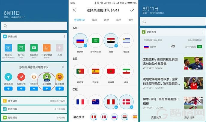 除了上面提到的小爱同学在硬件方面的支持,本次世界杯小米MIUI系统负一屏“信息助手”页面也上线了观看比赛直播功能。只要小米手机系统是MIUI9.5或以上版本,在世界杯开始前都会陆续收到升级推送,升级后就可以直接在负一屏的“足球看台”实时查看赛程、比分以及小组积分等信息,并能够通过负一屏直接进入优酷观看当前比赛直播。
