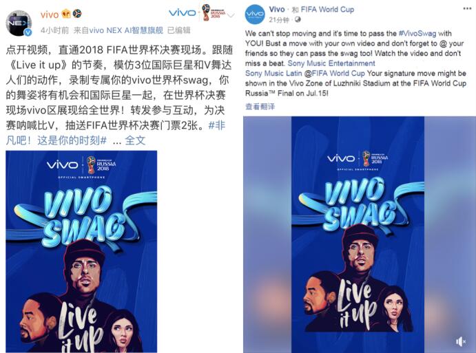 2018年7月5日, vivo在全球官方平台发起了全球球迷互动活动——vivo世界杯swag。活动中,vivo与Sony Music打造的世界杯主题曲《Live it up》深度联合,创造了世界杯主题曲专属庆祝动作——“vivo swag”,全世界的足球粉丝都可以倾情参与,一起热舞,为即将到来的世界杯决战时刻加油助威。