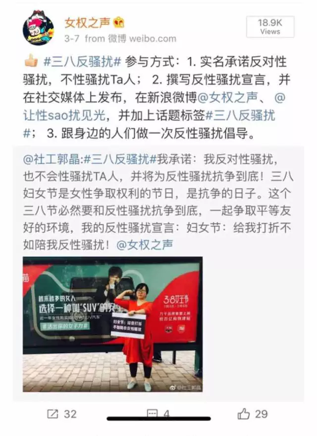 与阿风类似的声音,在三八节当天通过 #三八反骚扰# 这个活动的连结,在微博上有了一次比较大型的集体发声。