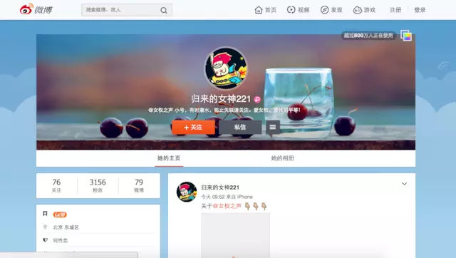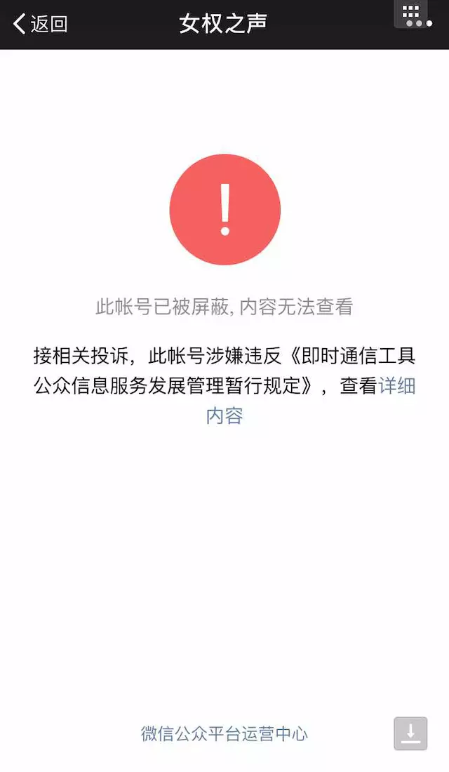 正当蔓蔓与一群关心女权之声账号的粉丝们还在询问停掉账号的原因时。短短不到 12 个小时之内,“女权之声” 的备用微博小号 “归来的女神 221” 以及微信公众号,分别在下午 3 点,以及下午 5 点左右相继停掉。