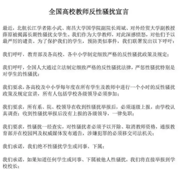 1 月 19 日武汉大学新闻与传播学院的特聘教授、博导徐开彬,联合校内的一些年轻教授们,共同签署了《全国高校教师反性骚扰宣言》。这份宣言上累积了超过 50 名的教授以实名的方式签署,呼吁教育部能重视“反性骚扰”的重要性,建立相关政策与规范,也希望全国人大能设立严格的反性骚扰法律。
