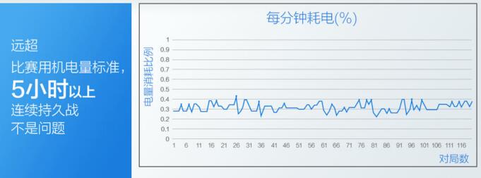 不管是专业选手还是普通手游玩家,对于手机的游戏续航自然是越长越好,因此在电池续航这一基础要求中,vivo NEX在4000mAh大电池打底下还支持双引擎快充,能够很好满足长时间的游戏体验,更是满足电竞赛事打满所有场次无须更换的要求。在116场对局数里,NEX的每分钟耗电始终维持在0.3%左右,整体成绩远超比赛用机电量标准,5小时以上的连续持久战不是问题。