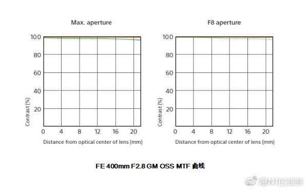 索尼在SEL400F28GM中采用了17组23片镜片的设计结构,其中包含3枚萤石镜片,以减少纵向色差和横向色差。镜头同时采用一枚ED超低色散镜片,来抑制色散的产生。出色的光学设计和萤石等光学镜片的采用,使索尼G大师镜头FE 400mm F2.8 GM OSS的MTF曲线表现非常出色,即使是在画面边缘分辨率也同样出色。