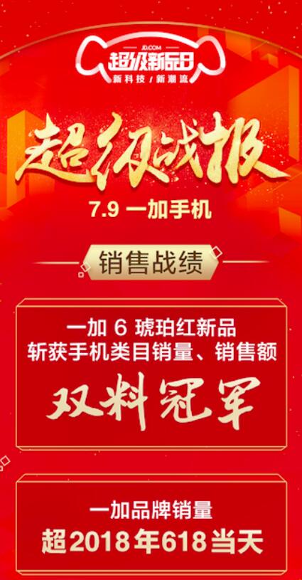 日前,一加6琥珀红(8GB RAM+128GB ROM)在中国地区正式首销,一加6京东超级新品日也于首销当天展开。据京东发布的超级战报数据显示,全速旗舰一加6此次收获颇丰,仅凭单款旗舰新品就在超级新品日当天连创佳绩:一加6琥珀红斩获手机类目销量、销售额双料冠军;一加品牌销量超越2018年618当天。