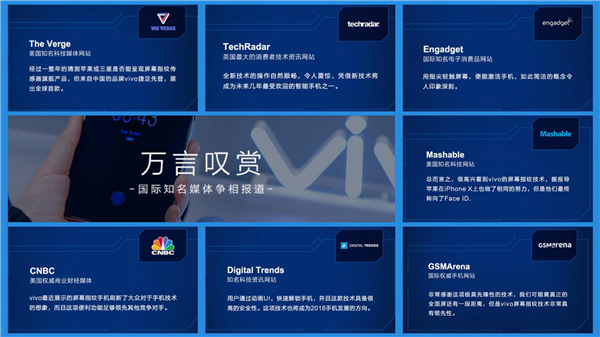 近年来为国人熟知的The Verge说到:经过一整年的猜测苹果或三星是否能呈现屏幕指纹传感器旗舰产品,但来自中国的品牌vivo捷足先登,展出全球首款。谈到vivo屏幕指纹新机的使用体验时,国际知名电子消费品网站Engadget评价说:用指尖轻触屏幕,便能激活手机,如此简洁的概念令人印象深刻。“