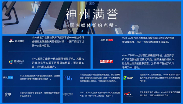 vivo屏幕指纹技术,在国内也引起了巨大的轰动。新浪科技评论到:vivo拿出了世界首款屏下指纹手机--在这个行业硬件发展摸到天花板的时候,中国厂商给了世界一次意外惊喜。2018CES发布时间是在开年,网易科技认为:vivo X20Plus全球首款屏幕指纹手机,为2018年智能手机市场开了一个好头。