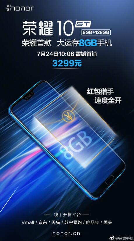 7月20日,荣耀官方微博@荣耀手机宣布,#荣耀10GT#8GB+128GB版7月24日10:08在Vmall、京东、天猫、苏宁易购等平台正式首销,仅售3299元。此次发布的是荣耀手机历史上首款8G8运存手机。8GB内存的推出标志着荣耀10在版本序列上更加完善,也将带给用户更极致畅快的用机体验。而此前,荣耀10先后公布升级GPU Turbo、AIS手持超级夜景两项吓人技术,在游戏体验和夜景拍照上得到大幅提升,软硬件的全面升级让荣耀10 GT成为名副其实的全能旗舰。