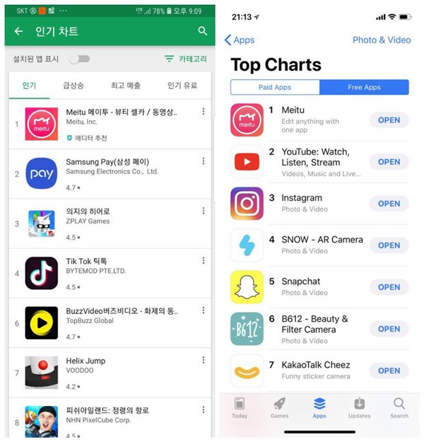 近日,美图秀秀荣登韩国安卓应用商店总榜、App Store免费应用总榜榜首,超越YouTube、Instagram、Snapchat等海外巨头型应用,目前已成为最受韩国年轻人欢迎的影像类APP。