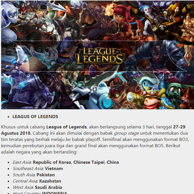 原文内容翻译:英雄联盟项目将持续3天,2018年8月27日至29日。将从小组赛阶段开始,以确定有资格晋级淘汰赛的前两支队伍(或许是每个小组两名)。半决赛将使用BO3赛制,季军赛和决赛的比赛将采用BO5赛制。 以下是将参与比赛的队伍: