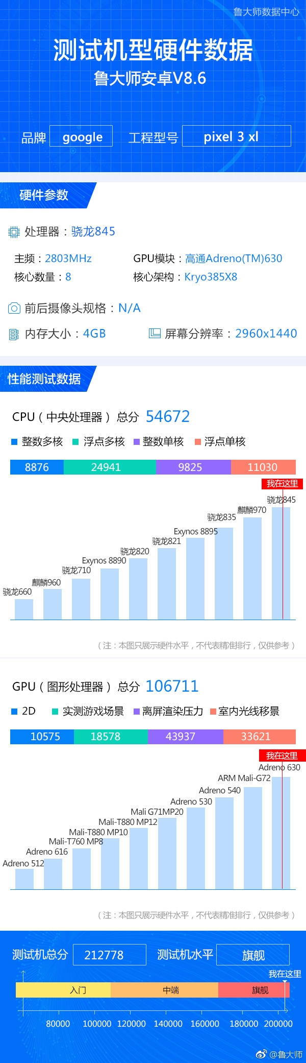 如图所示,谷歌Pixel 3 XL屏幕分辨率为2960×1440,屏幕纵横比为18.5:9,搭载高通骁龙845处理器,配备4GB内存,鲁大师跑分达到了212778。