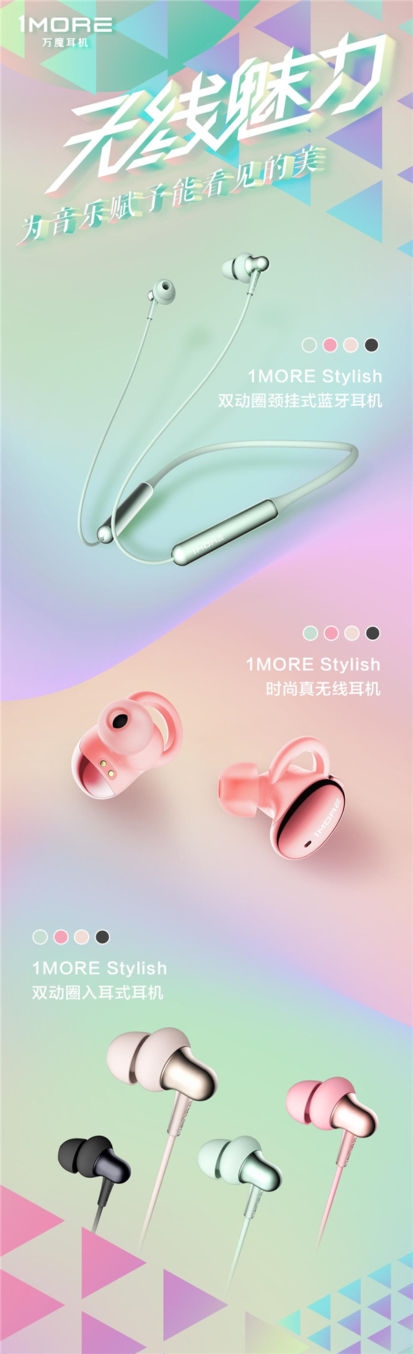 Stylish系列囊括有线与蓝牙耳机,4款时尚配色,液态类金属设计,时尚的外观让Stylish深受外观党喜爱。高颜值并不能夺去它声音高素质的优点,“石墨烯+金属钛”同轴双动圈令消费者感受时尚科技产品的同时享受纯净的好音乐。1MORE Stylish 时尚真无线耳机的发布更让许多人眼前一亮,真无线更自由,小巧的体积和明亮的配色让它成为绝对的吸睛焦点。