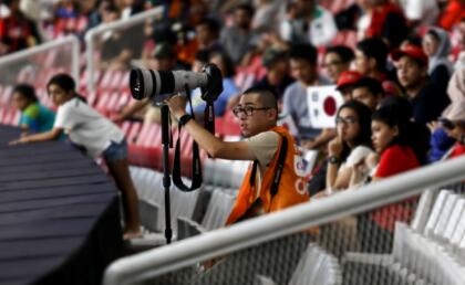 体育摄影记者使用佳能设备拍摄亚运会田径赛事