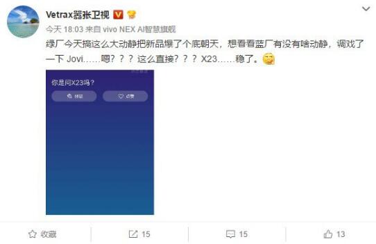 这款机型的最初曝光是通过知名数码达人@Vetrax嚣张卫视所发的一条微博,当时他与Jovi的对话内容被截图,正式曝光了vivo新机的命名,在Jovi的助攻之下,vivo X23一时间成为业内外的谈论焦点。