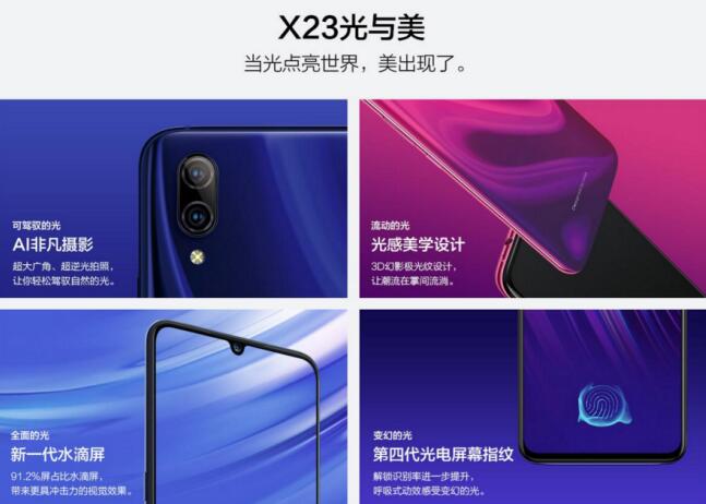 微博官宣的同时,在vivo官网,vivo X23开启了预约活动,并曝光了部分功能。从曝光的产品信息来看,vivo X23采用了19.5:9的水滴屏,屏占比高达91.2%,能够给用户带来更加出色的观感。拍照方面,超大广角、超逆光、AI摄影等,能够在使用时为用户带来无与伦比的拍照体验。其中超大广角+超逆光两大功能,完美诠释了“发现更多美”和“所见即所得”的产品哲学。这两项功能通过硬件+软件的组合进行全新优化,可以帮助用户真实感知到vivo X23拍照就是一个发现更多美,并所见即所得的过程。而极具特点的光感美学外观设计则让vivo X23有了时尚气息。第四代光电屏幕指纹在性能和识别率的表现上变得更加强大,搭配全新的呼吸特效、水滴解锁特效,凸显了时尚的流光之美。