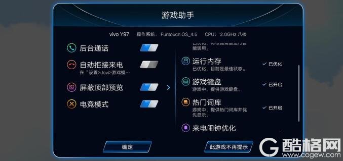 除了硬件参数方面,vivo Y97还为喜欢游戏的用户设置了一个特殊的功能——游戏模式4.0。其包含了游戏助手、电竞模式、挂机模式等功能,不仅进一步提升了手机的游戏性能,也让用户在游戏中免受打扰,为游戏体验加分。