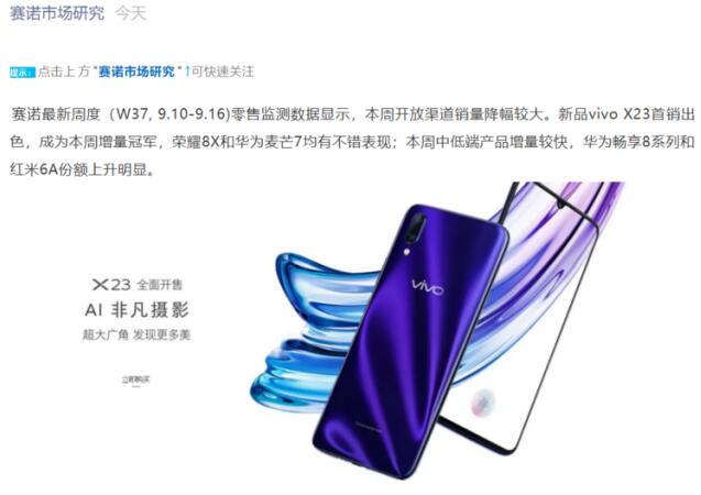 赛诺大数据:vivo X23逆势上涨,强势夺下本周增量冠军