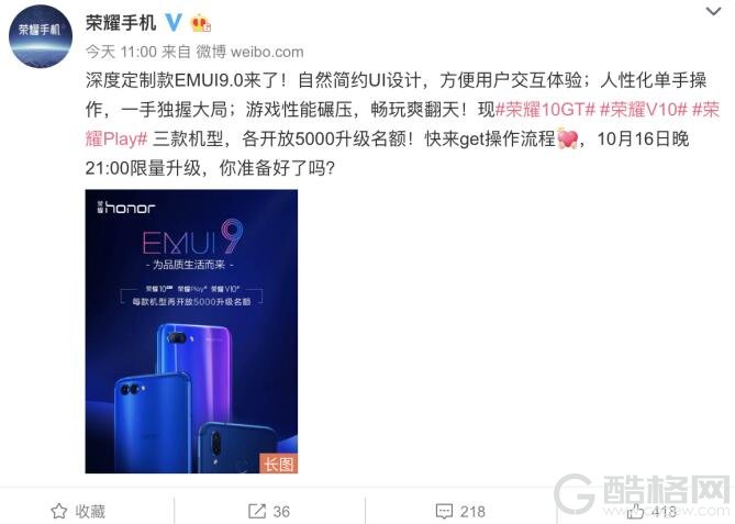 荣耀10GT开启安卓9.0公测,5000名花粉抢先质享生活