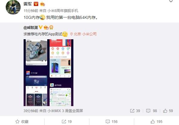 小米MIX 3配备10GB内存 雷军:我用第一台电脑才64K内存