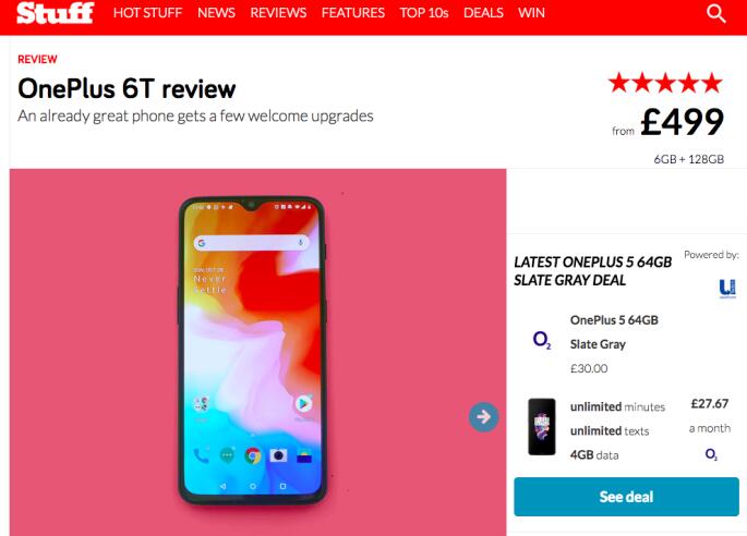 《Stuff》此前就对一加6大加赞赏,它称:一加6已经是一部很棒的手机了,一加6T再一次获得了很棒的升级。