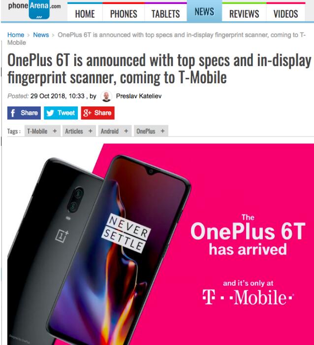 《PhoneArena》称一加6T带来了顶级的配置和屏幕指纹,并提到一加6T已经可以在T-Mobile购买。