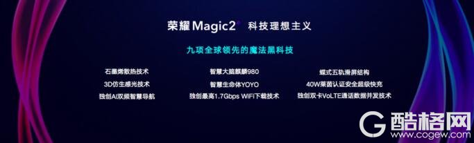历经两年时间打造的荣耀Magic2,传承了荣耀Magic一代的探索基因,秉持对极致科技的追求和敬畏精神,实现全面进化。作为全球首款AI滑屏全面屏以及全球首款AI六摄智能手机,荣耀Magic2带来了极致的科技体验。在发布会浓墨重彩介绍的YOYO,是活在AI系统中可成长的智慧生命体,智商高达4556分,具备认知、学习、思考、进化的能力,全面开启全场景智慧之旅。与此同时,荣耀Magic2搭载“Magic Slide魔法全视屏、智慧大脑麒麟980、石墨烯散热技术、40W莱茵认证安全超级快充、3D仿生感光技术、全球首创双卡VoLTE数据通话并发技术、全球首创AI双频智慧导航、全球首创1.7Gps Wi-Fi下载速度”等九大自主研发全球领先科技,成为一款实力卓绝的未来超旗舰,为消费者带来超乎期待的惊喜。