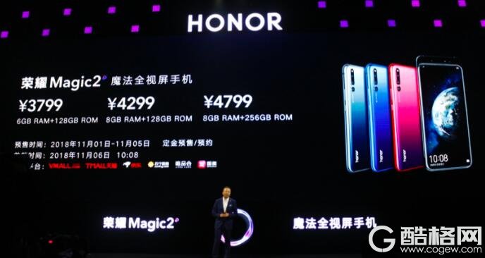 荣耀Magic2搭载新一代智慧大脑麒麟980芯片,拥有超强性能。荣耀Magic2发布四个版本,其中6GB+128GB版本售价3799元,8GB+128GB版本售价4299元,8GB+256GB版本售价4799元,8GB+512GB 3D感光版本售价5799元,提供渐变红、渐变黑、渐变蓝三种炫酷配色,将于11月1日0:00至11月5日23:30在华为商城、天猫、京东、苏宁易购、唯品会、国美启动100元定金预售,11月6日10:08在以上平台正式发售。