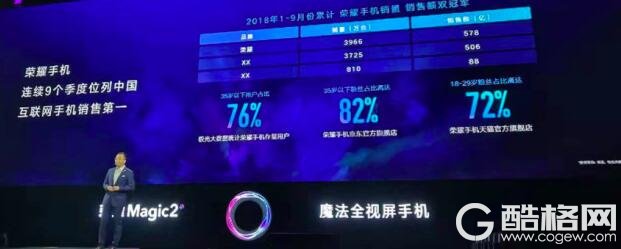 2018年,在全球智能手机市场增长遇冷的大势下,荣耀继续乘风破浪的亮眼表现。在国内市场,连续9个季度位列中国互联网手机销售第一,进一步夯实互联网手机第一品牌的地位。据赛诺数据显示,2018年1-9月,荣耀手机以3966万台的销量、578亿元的销售额,双双进入中国手机市场的前五,这也是唯一入围TOP5的互联网手机品牌。同时,荣耀在全球74个国家市场以荣耀模式纵深布局、深度耕耘,强势进入快速增长通道。