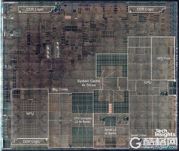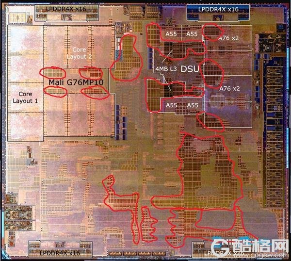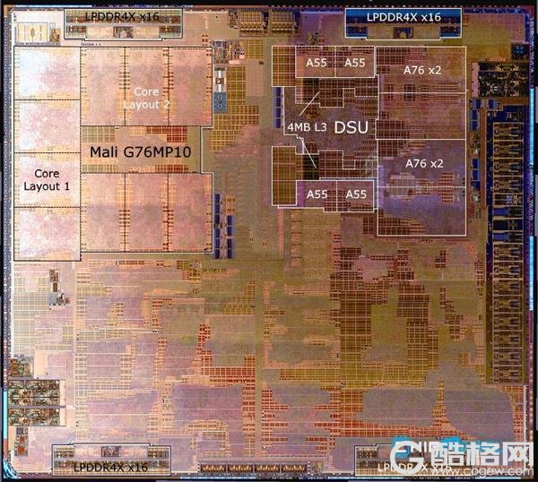 与宏观规格相应,逻辑电路图上显示4颗Cortex A76核心为两两成对设计,每颗Cortex A76核心均配有512KB独享L2缓存。而在4颗Cortex A55中间夹着的是容量为4MB的L3缓存以及DynamIQ共享单元DSU,每颗Cortex A55均配有独享的128KB L2缓存。