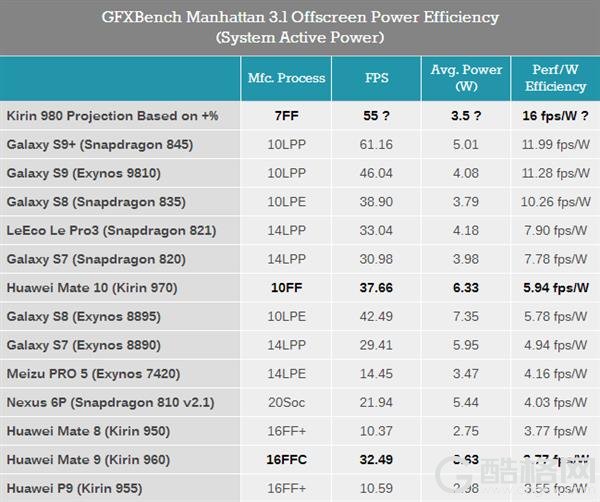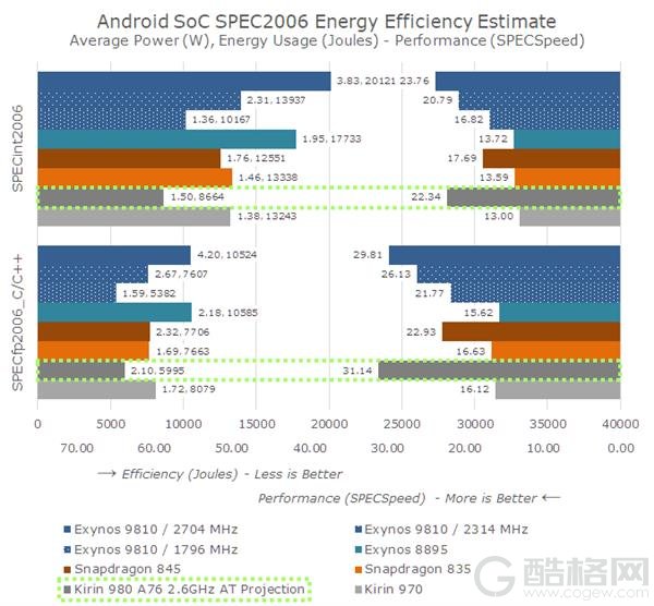 麒麟980中2.6GHz的Cortex A76性能达到或超过2.7GHz的三星Exynos 9810并无问题,相比骁龙845则可领先30%左右,且7nm工艺下2.6GHz的Cortex A76核心功耗甚至低于1.8GHz的三星Exynos 9810,能耗比冠绝全场。