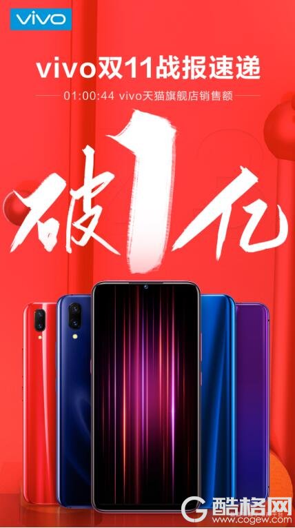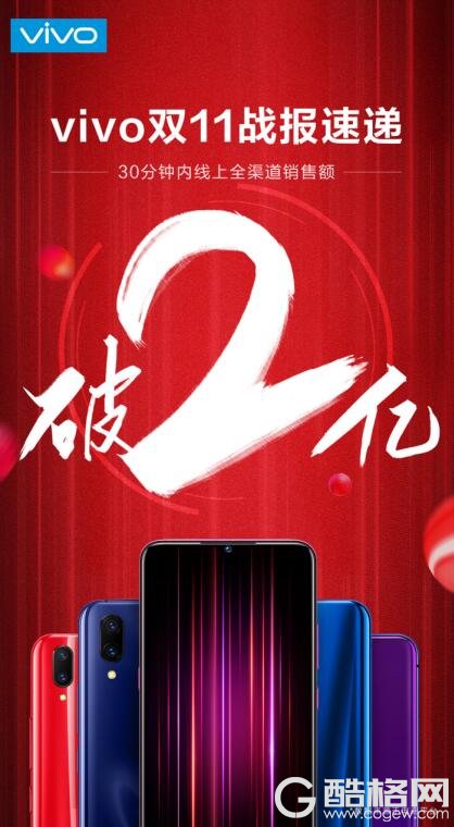 手机品类一直是双11期间的热销品类之一,而vivo的表现也一直是其中的佼佼者。作为vivo品牌双11期间重要的销售渠道之一,vivo天猫旗舰店在11月11日1点44秒销售额便突破了1亿元。同时在双11开始后,vivo在线上全渠道的销售额仅用30分钟就突破了2亿元。