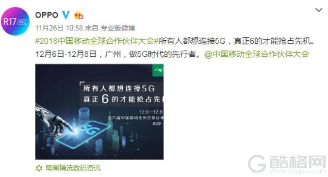 2018年11月26日,OPPO官方微博发布了一张海报,透露OPPO将参加12月6日-8日在广州举办的第六届中国移动全球合作伙伴大会。海报文案“所有人都想连接5G,真正6的才能抢占先机”,暗示OPPO将继续领跑5G时代,抢占技术先机。