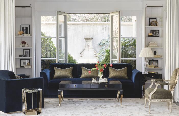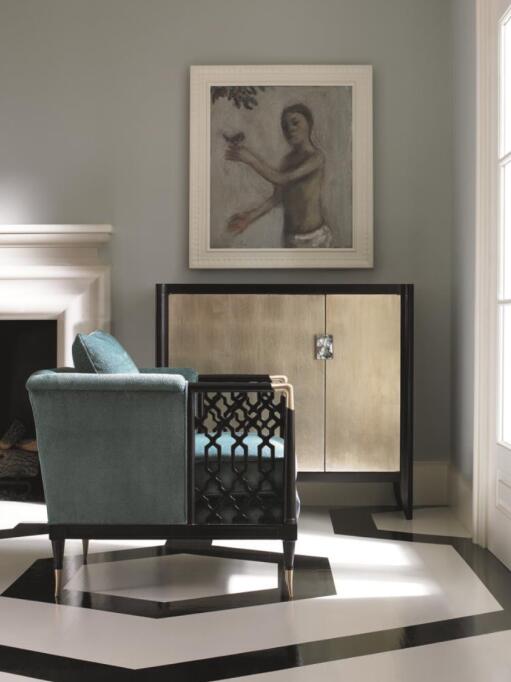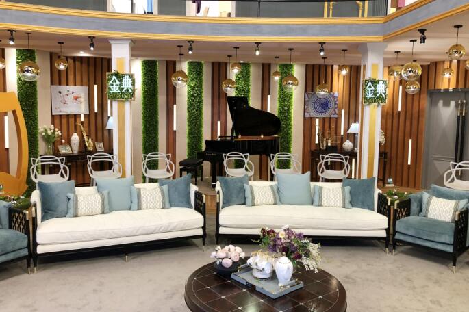 大厅摆放着的这组沙发就是美克美家旗下Caracole极具代表性的单品,孔雀蓝的奢华手感面料搭配扶手的镂空图案,使得这款沙发椅散发着独特的魅力,无论从哪个角度看都是美不胜收。这一种美的呈现正是对这个节目的致敬,为我们带来音乐享受的同时,也能随时感受生活中美的气息。
