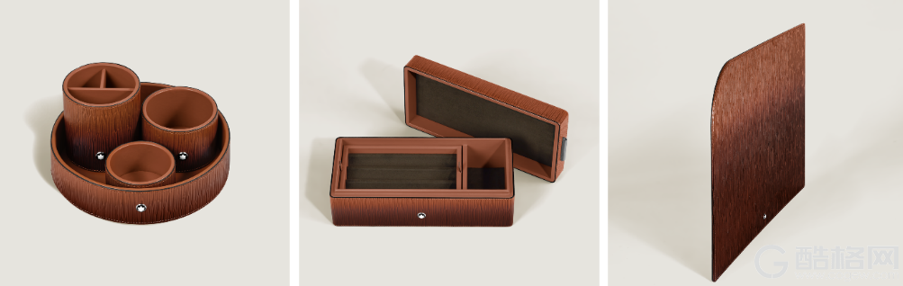 万宝龙树纹圆形托盘、圆形笔筒枫叶棕(左)万宝龙树纹多功能收纳盒枫叶棕(中)万宝龙树纹皮质桌垫枫叶棕(右)